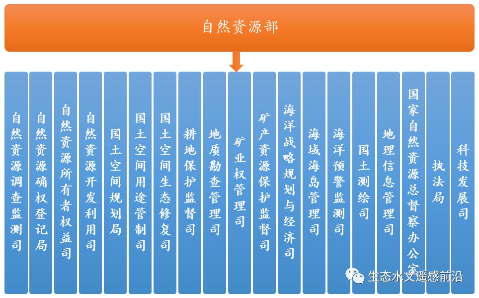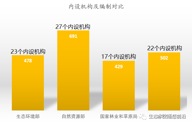 生態(tài)環(huán)境部設(shè)立自然生態(tài)保護(hù)司等23個內(nèi)設(shè)機(jī)構(gòu);自然資源部設(shè)立自然資源調(diào)查監(jiān)測司等27個內(nèi)設(shè)機(jī)構(gòu);國家林業(yè)和草原局設(shè)立生態(tài)保護(hù)修復(fù)司等17個內(nèi)設(shè)機(jī)構(gòu);水利部設(shè)立水資源管理司等22個內(nèi)設(shè)機(jī)構(gòu)。
