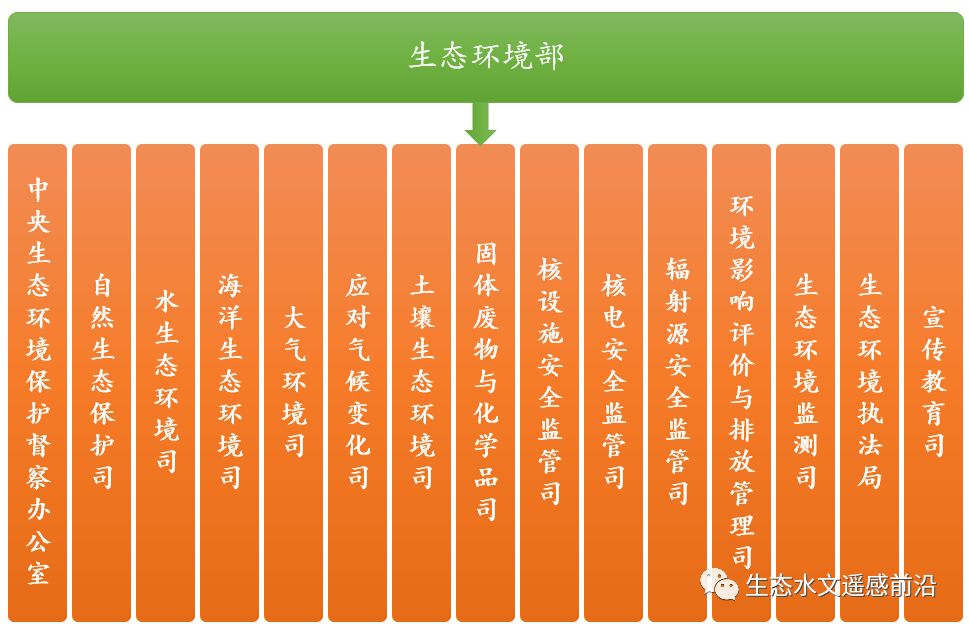 生態(tài)環(huán)境部、自然資源部、國家林業(yè)和草原局、水利部除設(shè)置辦公廳、綜合司、法規(guī)司、人事司、財務(wù)司、國際合作司、機(jī)關(guān)黨委和離退休干部辦公室等司局外,生態(tài)環(huán)境部還下設(shè)中央生態(tài)環(huán)境保護(hù)督察辦公室、自然生態(tài)保護(hù)司(生物多樣性保護(hù)辦公室、國家生物安全管理辦公室)、水生態(tài)環(huán)境司、海洋生態(tài)環(huán)境司、大氣環(huán)境司(京津冀及周邊地區(qū)大氣環(huán)境管理局)、應(yīng)對氣候變化司、土壤生態(tài)環(huán)境司、固體廢物與化學(xué)品司、核設(shè)施安全監(jiān)管司、核電安全監(jiān)管司、輻射源安全監(jiān)管司、環(huán)境影響評價與排放管理司、生態(tài)環(huán)境監(jiān)測司、生態(tài)環(huán)境執(zhí)法局、宣傳教育司等機(jī)構(gòu)。