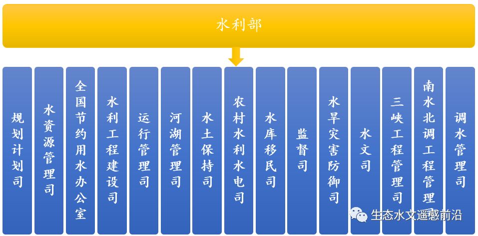 水利部下設(shè)規(guī)劃計劃司、水資源管理司、全國節(jié)約用水辦公室、水利工程建設(shè)司、運(yùn)行管理司、河湖管理司、水土保持司、農(nóng)村水利水電司、水庫移民司、監(jiān)督司、水旱災(zāi)害防御司、水文司、三峽工程管理司、南水北調(diào)工程管理司、調(diào)水管理司等機(jī)構(gòu)。