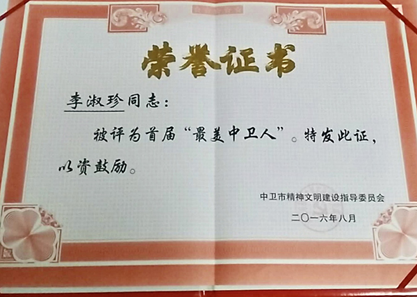 中衛(wèi)市還將環(huán)衛(wèi)工人列入“感動中衛(wèi)人物”、“市級勞?!钡仍u先選優(yōu)范圍,進一步激發(fā)了環(huán)衛(wèi)工的榮譽感和勞動熱情。圖為環(huán)衛(wèi)工人李淑珍取得的“最美中衛(wèi)人”榮譽證書。光明網(wǎng)王麗媛/攝