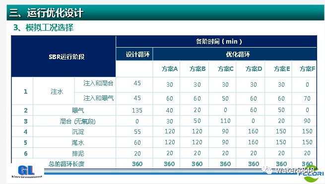 搭建上述污水處理廠工藝模型后,選擇平均流量和峰值流量在3種不同的溫度下構(gòu)成6套工藝方案。對原SBR設(shè)計循環(huán)進(jìn)行優(yōu)化,增加混合段時間,形成6種優(yōu)化循環(huán)方案。