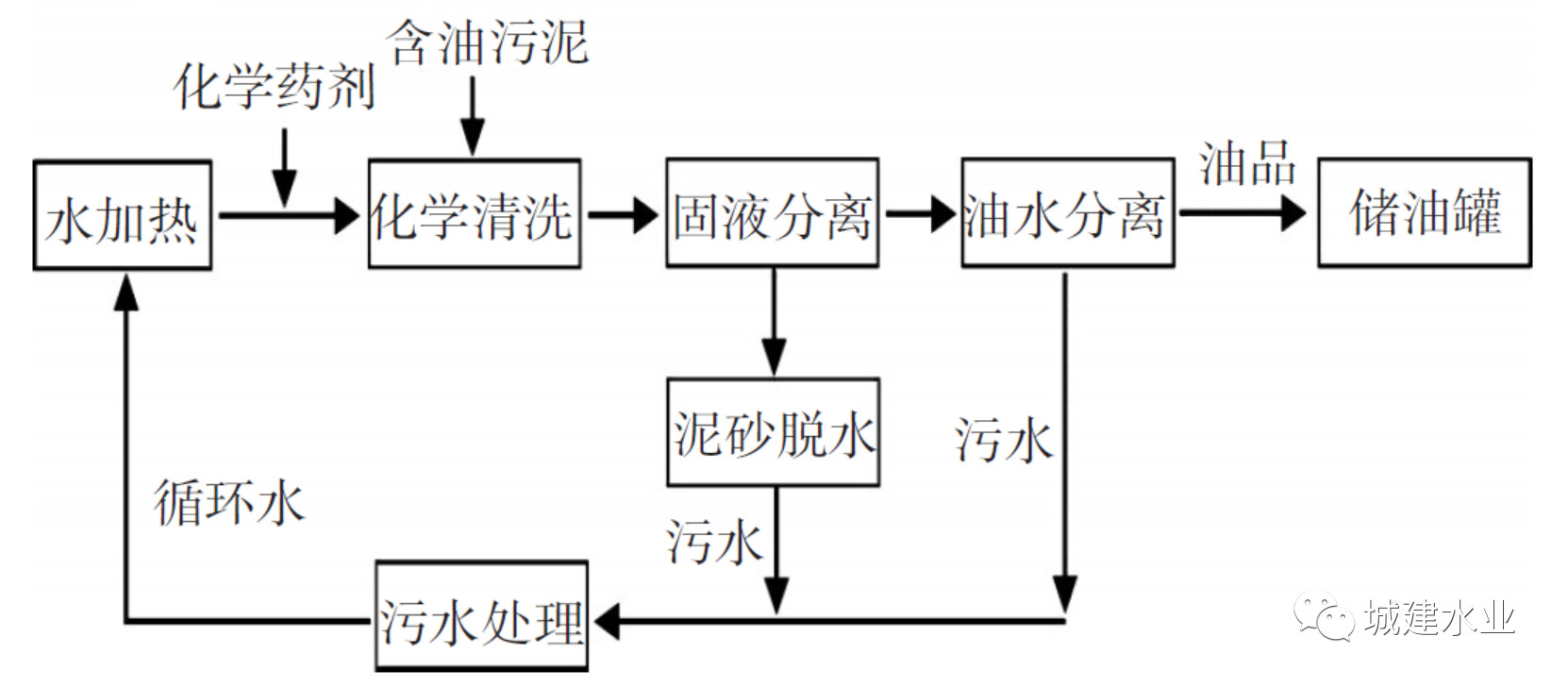 熱水洗滌法是美國環(huán)保署處理含油污泥優(yōu)先采用的方法,主要用于含泥沙多顆粒大的含油污泥的處理。一般以熱堿水溶液反復洗滌,再通過氣浮實現(xiàn)固液分離。洗滌溫度多控制在70℃左右,液固比2:l,洗滌時間20min,能將含油量為30%落地油泥洗至殘油率l%以下?;旌蠅A可由廉價的無機堿和無機鹽組成。具體工藝流程見圖3.4。該方法能量消耗低,費用不高,是我國目前研究較多、較普遍采用的含油污泥處理方法。