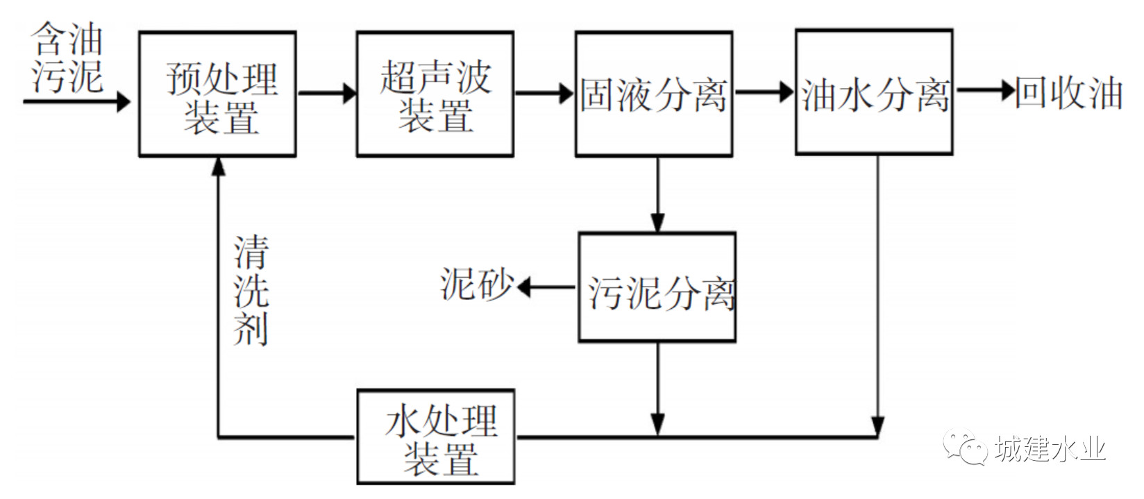 超聲處理技術(shù)是通過聲場的機械振動、空化效應及熱作用來破壞含油污泥的結(jié)構(gòu),降低污泥中原油的黏度,減小原油與無機固體間的黏附作用,從而使含油污泥中的油和泥砂分離。其工藝流程如圖3.5所示:①清洗劑預處理含油污泥;②超聲分離油泥,使原油與固體顆粒分離;③旋液分離器分離油水和泥砂,泥砂通過離心機脫水,油水經(jīng)分離器分離出油。