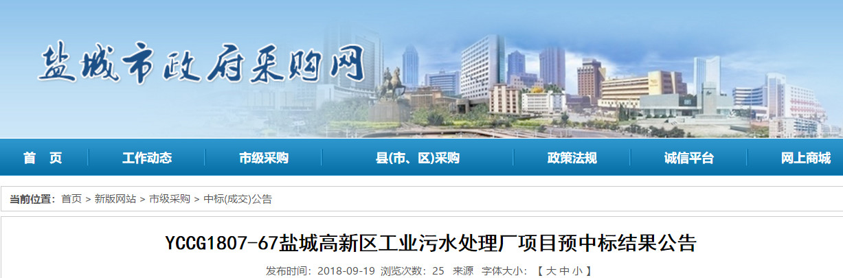 YCCG1807-67鹽城高新區(qū)工業(yè)污水處理廠項目預(yù)中標結(jié)果公告
