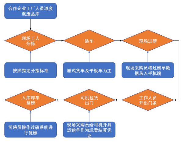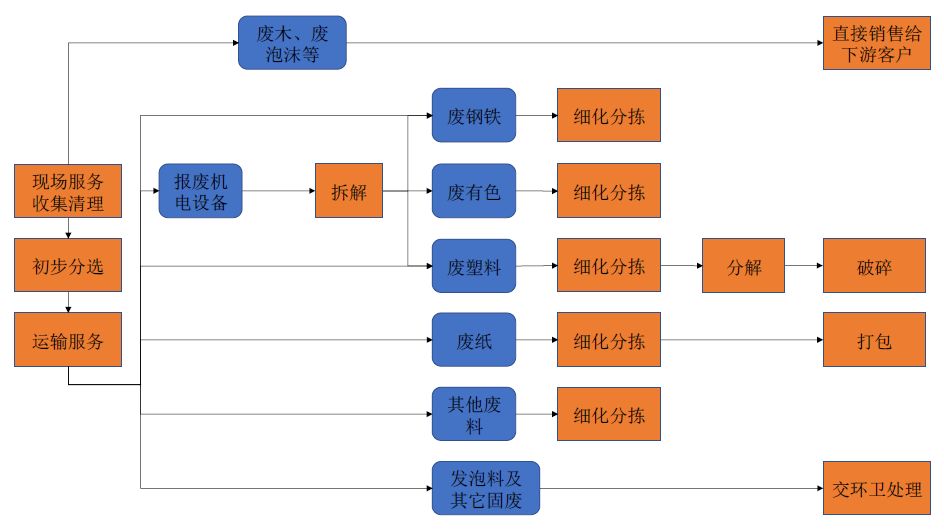 根據(jù)中再環(huán)服與供應(yīng)商的合作約定,中再環(huán)服派業(yè)務(wù)人員駐扎在供應(yīng)商廠區(qū),在現(xiàn)場(chǎng)進(jìn)行廢料的初步分揀,現(xiàn)場(chǎng)分揀出的廢泡沫、廢木頭等直接銷(xiāo)售給下游客戶,其余廢料拉回倉(cāng)儲(chǔ)地,做進(jìn)一步的深度分揀處理。
