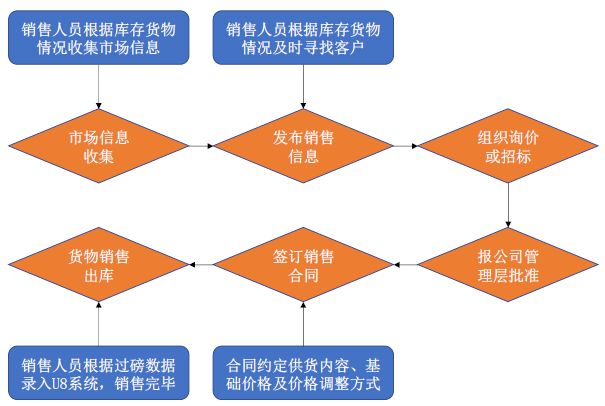 由中再環(huán)服銷(xiāo)售部負(fù)責(zé)組織實(shí)施銷(xiāo)售業(yè)務(wù),中再環(huán)服銷(xiāo)售部首先通過(guò)信息收集,了解同類(lèi)產(chǎn)品的市場(chǎng)價(jià)格。其次,通過(guò)經(jīng)常性業(yè)務(wù)往來(lái),中再環(huán)服與客戶建立了長(zhǎng)期穩(wěn)定的合作關(guān)系,中再環(huán)服通過(guò)與客戶簽訂年度合作框架協(xié)議約定基準(zhǔn)價(jià)格和價(jià)格調(diào)整方式,或者銷(xiāo)售人員根據(jù)庫(kù)存貨物情況及時(shí)尋找客戶進(jìn)行詢價(jià)或組織競(jìng)標(biāo);經(jīng)管理層批準(zhǔn)后,銷(xiāo)售部與客戶簽訂銷(xiāo)售合同。具體的銷(xiāo)售流程圖如下: