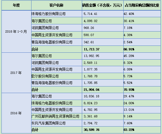 3、和大型知名企業(yè)的合作協(xié)議都簽到了2021年,穩(wěn)定性肯定沒(méi)問(wèn)題:“中再環(huán)服與海爾集團(tuán)、格力電器、東風(fēng)汽車(chē)均維持多年合作關(guān)系,歌爾股份雖為2017年新增客戶,但雙方已簽訂了截至2021年的長(zhǎng)期合同,各大供應(yīng)商均對(duì)中再環(huán)服有較高的認(rèn)可度。因此,中再環(huán)服與上述大型企業(yè)建立的合作關(guān)系是可持續(xù)的?!?/p>