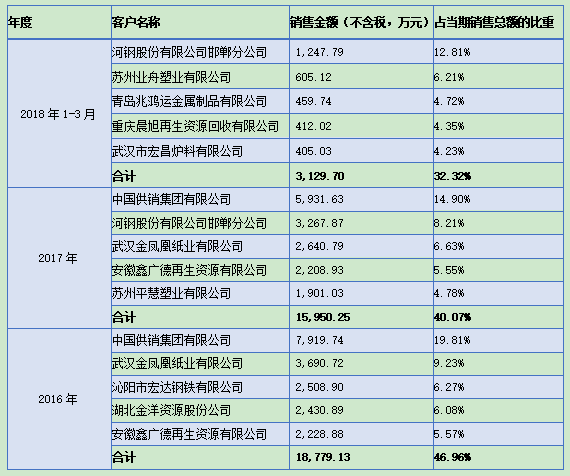 其中,中國(guó)供銷(xiāo)集團(tuán)有限公司和中再環(huán)服的業(yè)務(wù)往來(lái)屬于關(guān)聯(lián)交易,前5大客戶的銷(xiāo)售占比逐漸下降。