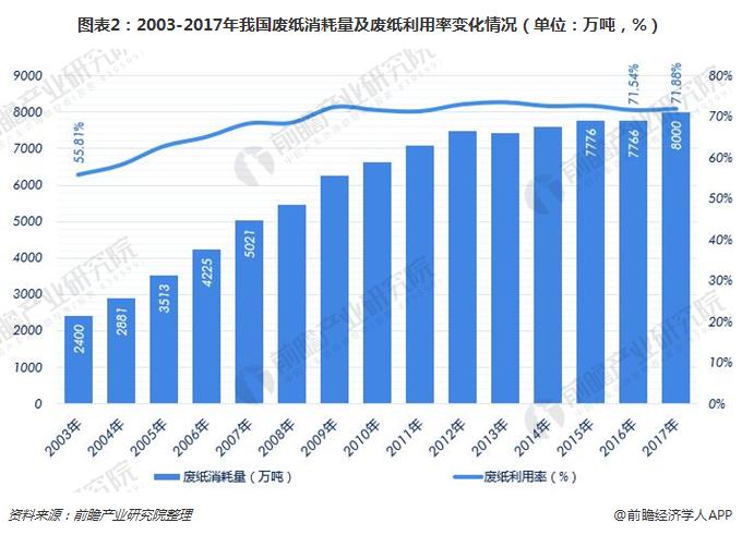 前瞻產(chǎn)業(yè)研究院長(zhǎng)期監(jiān)測(cè)數(shù)據(jù)顯示,廢紙漿是我國(guó)最大的造紙生產(chǎn)原料,2017年廢紙漿消費(fèi)量占比達(dá)到了62.7%。近年來(lái)我國(guó)廢紙消耗量逐年上升,從2003年的2400萬(wàn)噸上升至2017年的8000萬(wàn)噸左右,廢紙的利用率也從2003年的55.81%進(jìn)一步提升至71.88%。