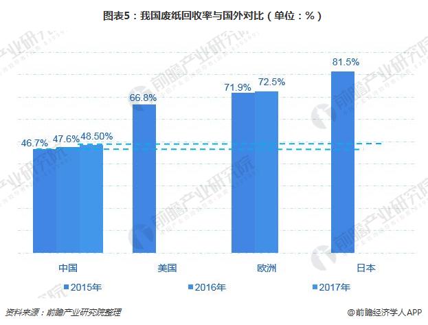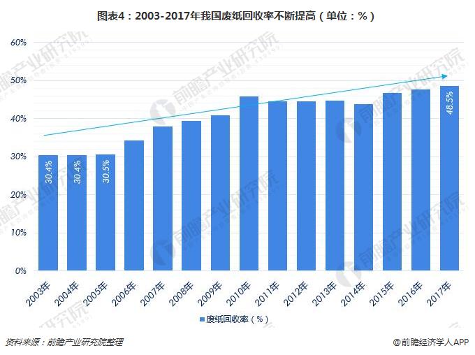 我國(guó)的廢紙回收率也從2003年的30.4%提升至了2017年的48.5%,上升了18.1個(gè)百分點(diǎn)。雖然我國(guó)廢紙回收率不斷提高,但與發(fā)達(dá)國(guó)家仍存在較大差距。據(jù)統(tǒng)計(jì),目前發(fā)達(dá)國(guó)家的廢紙回收率高達(dá)80%,甚至有些國(guó)家可以達(dá)到100%。國(guó)內(nèi)廢紙回收率與國(guó)外廢紙回收的差距,也正是造成我國(guó)廢紙長(zhǎng)期依賴進(jìn)口的主要原因之一。