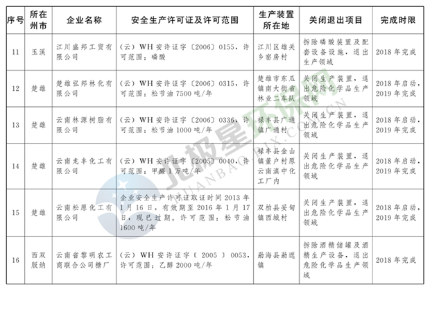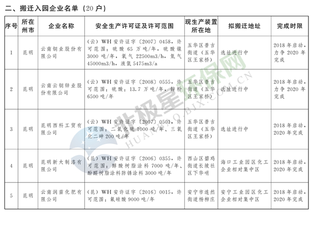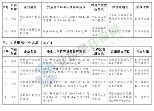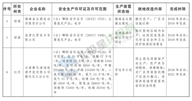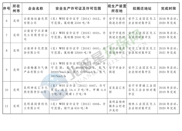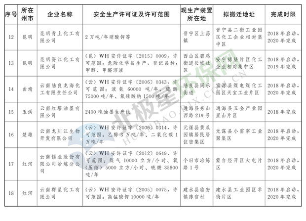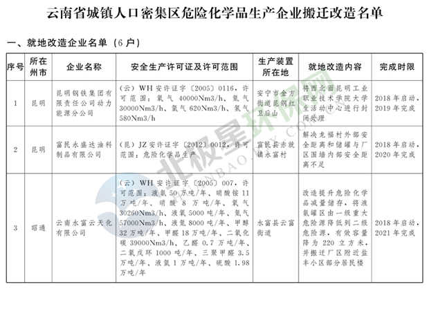 日前云南省人民政府發(fā)布了《云南省城鎮(zhèn)人口密集區(qū)危險(xiǎn)化學(xué)品生產(chǎn)企業(yè)搬遷改造名單》,其中就地改造企業(yè)6戶,搬遷入園企業(yè)20戶,關(guān)閉退出企業(yè)16戶,具體名單見正文: