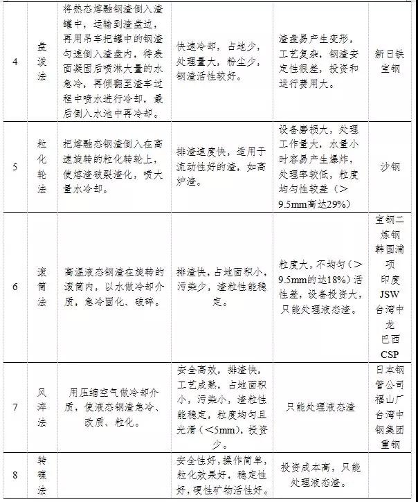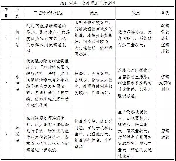 鋼渣的一次處理是把熱熔渣處理成粒徑符合一定要求的常溫塊渣,以有利于鋼渣的二次處理。目前國內(nèi)鋼渣一次處理主要工藝有:熱潑法、風(fēng)淬法、滾筒法、?;喎?、熱悶法等,其中熱潑法、滾筒法、熱悶法最為常用。表1綜合比較了各種工藝的特點(diǎn)。