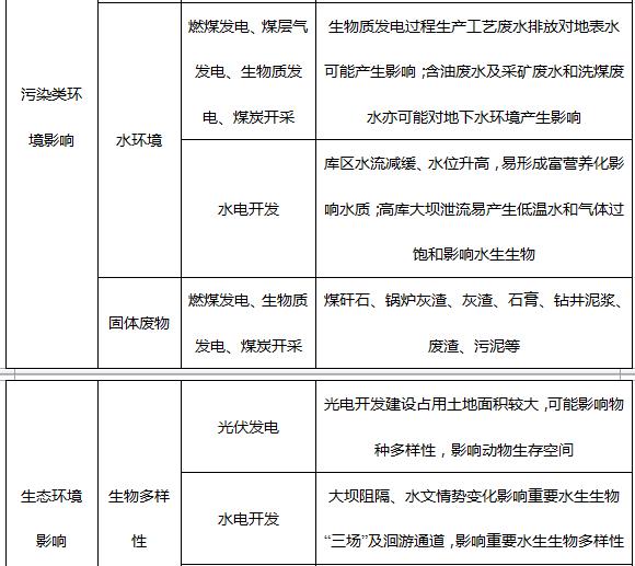 4、生態(tài)環(huán)境影響:煤礦開采造成采空塌陷區(qū),導(dǎo)致土壤龜裂,山體滑坡,水資源流失,耕地毀壞;光電開發(fā)占用土地面積較大,影響動物生存空間,對物種多樣性有一定影響;水電開發(fā)造成水文情勢變化,影響水生生物“三場”及洄游通道,影響水生生物多樣性;風(fēng)電開發(fā)風(fēng)機可能對鳥類的覓食、休憩和遷飛等活動行為產(chǎn)生一定的不利影響。