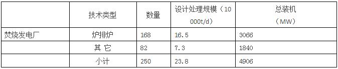 截至2 0 1 6年底,投入運(yùn)行的生活垃圾焚燒發(fā)電廠有250座,總處理能力為23.8萬(wàn)噸/日,總裝機(jī)約為4906MW。其中采用爐排爐的焚燒發(fā)電廠有168座,合計(jì)處理能力達(dá)到16.5萬(wàn)噸/日,裝機(jī)達(dá)到3040MW;其余主要為采用流化床的焚燒發(fā)電廠,總計(jì)有82座,合計(jì)處理能力為7.3萬(wàn)噸/日,裝機(jī)達(dá)到1840MW(見下表)。