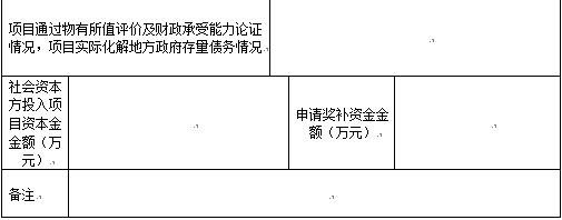 第六條 試點項目落地獎補資金采取申報制,由項目所在市、縣財政部門向省財政廳申報,省財政廳PPP辦公室采取材料審核、實地復核等方式對項目進行綜合評審,并對評審通過的獎補項目進行公示。申報材料包括: