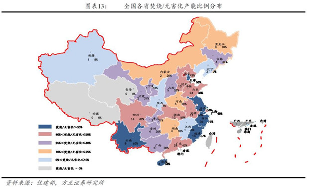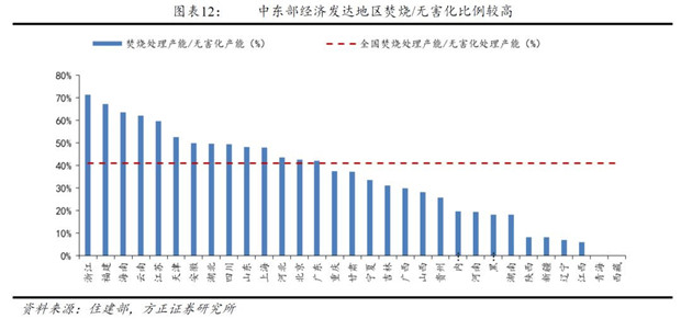 從焚燒處理占無害化產(chǎn)能比例來看,2016年全國焚燒處理占無害化處理比例為41%,全國有14個省焚燒處理占無害化處理比例超過該比例,且大多分布在中東部經(jīng)濟(jì)發(fā)展程度較高的地區(qū),其中浙江省焚燒處理占無害化處理比例最高,達(dá)到了71%。