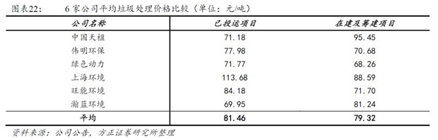 我們根據(jù)上市公司公開披露的項(xiàng)目信息統(tǒng)計(jì),取各個項(xiàng)目垃圾處置價(jià)格的平均值,對6家A股上市公司進(jìn)行比較。已投運(yùn)項(xiàng)目平均處置價(jià)格81元/噸,在建及籌建項(xiàng)目平均處置價(jià)格79元/噸,行業(yè)競爭激烈導(dǎo)致行業(yè)整體垃圾處置價(jià)格有所下降。