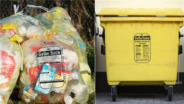 比如,黃桶(Gelbe Tonne)和黃袋(Gelber Sack)專門收集帶有綠點標志(Der Grüne Punkt)的輕型包裝。 其中包括,例如:空飲料罐、塑料包裝或者利樂磚飲料包裝(Tetrapacks)等。另外,也可以把塑料瓶裝入專門發(fā)放的、或購買的塑料袋子里,集中投放回收。這種黃袋可以到政府相關(guān)部門免費領(lǐng)取或從超市購買垃圾袋。