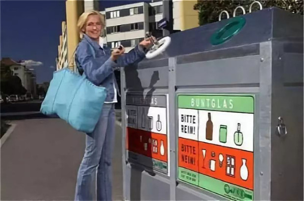 玻璃制品回收箱 :廢玻璃通過玻璃回收箱(Glascontainer)進行回收。同時有白色玻璃、雜色玻璃之分。有兩點事項需要注意:第一,請勿將帶有押金的包裝瓶(Pfandflaschen)丟入回收桶中;第二,玻璃瓶在丟棄前要去除瓶蓋,因為瓶蓋屬于黃桶廢棄物。