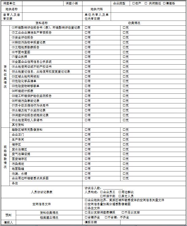 質(zhì)控人員查看地塊基本資料和輔助資料的收集情況、現(xiàn)場踏勘照片、人員訪談?dòng)涗?、地塊信息檔案情況和空間信息文件等資料,并填寫地塊調(diào)查表填報(bào)支撐材料情況(附錄 1),初步評(píng)判資料收集