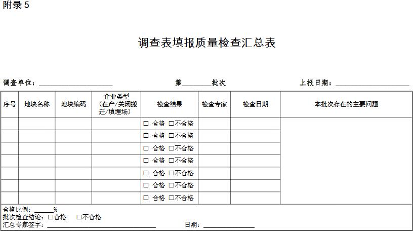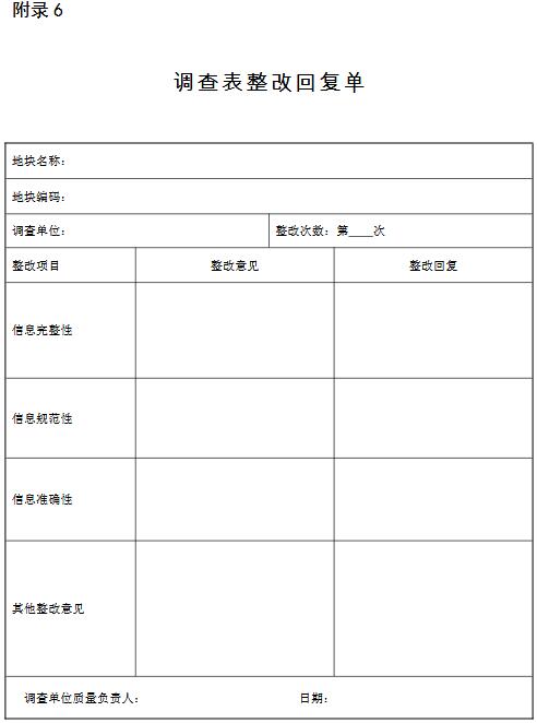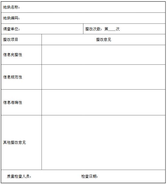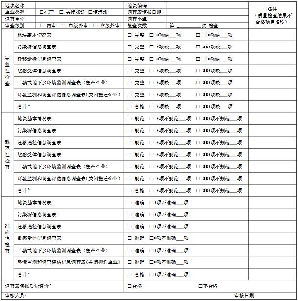 注: a:信息完整性檢查:若帶“*”的未填項(xiàng)數(shù)超過 2 個(gè)或不帶“*”的未填項(xiàng)數(shù)超過 5 個(gè),則判定為信息完整性檢查不合格;b:信息規(guī)范性檢查:若帶“*”的不規(guī)范填報(bào)項(xiàng)數(shù)超過 2 個(gè)或不帶“*”的不規(guī)范填報(bào)項(xiàng)數(shù)超過 5 個(gè),則判定為信息規(guī)范性檢查不合格;c:信息準(zhǔn)確性檢查:當(dāng)*項(xiàng)不準(zhǔn)確填報(bào)項(xiàng)數(shù)超過 2 個(gè),則判定為信息準(zhǔn)確性檢查不合格;d:調(diào)查表填報(bào)質(zhì)量評(píng)價(jià):完整性、規(guī)范性、準(zhǔn)確性三者有一項(xiàng)不合格則判定該地塊調(diào)查表填報(bào)為不合格;若三項(xiàng)均合格,統(tǒng)計(jì)調(diào)查表中帶“*”的未填信息項(xiàng)、不規(guī)范信息項(xiàng)和不準(zhǔn)確信息項(xiàng)總數(shù),超過 5 個(gè)則判定為調(diào)查表填報(bào)質(zhì)量不合格。對(duì)不合格調(diào)查表需出具整改意見單。