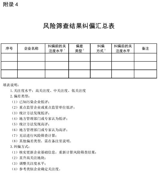 地方環(huán)保部門應(yīng)組織有關(guān)單位按照風(fēng)險(xiǎn)篩查結(jié)果糾偏意見,進(jìn)行問題整改。技術(shù)支持單位應(yīng)填寫風(fēng)險(xiǎn)篩查結(jié)果糾偏匯總表(附錄4),并連同專家論證會(huì)意見、糾偏專家信息表(附錄 5)、調(diào)整后的企業(yè)用地關(guān)注度劃分標(biāo)準(zhǔn)(附錄 6)上傳到詳查數(shù)據(jù)庫。風(fēng)險(xiǎn)篩查結(jié)果糾偏匯總表及專家論證會(huì)意見應(yīng)加蓋地方環(huán)保部門公章。