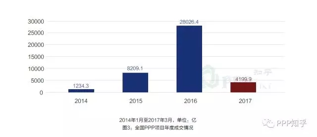 而中國自2014年以來,根據(jù)PPP知乎和龍?jiān)鞒堑氖袌龀山辉聢?bào)數(shù)據(jù),截止2017年3月31日,大約3年的時(shí)間成交項(xiàng)目總數(shù)就達(dá)到了2579個(gè),累計(jì)金額達(dá)到了4.17萬億元,并呈現(xiàn)了明顯的逐年加速態(tài)勢(參見《2017年3月全國PPP項(xiàng)目市場動態(tài)》)。