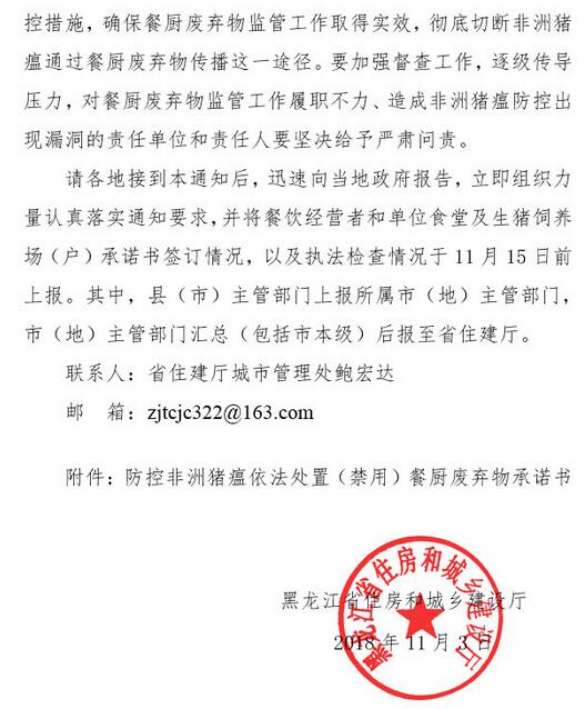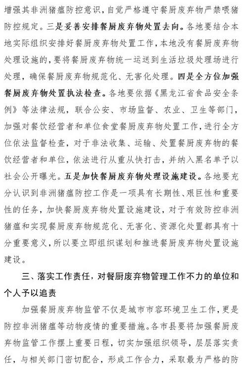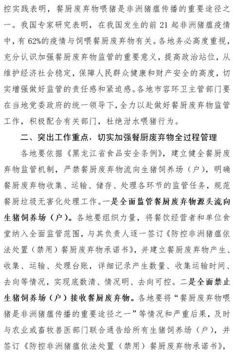 日前,黑龍江住建廳發(fā)布了關(guān)于防控非洲豬瘟加強(qiáng)餐廚廢棄物管理工作的緊急通知,《通知》指出,目前,全國和我省非洲豬瘟防控工作形勢十分嚴(yán)峻。國際非洲豬瘟防控實(shí)踐表明,餐廚廢棄物喂豬是非洲豬瘟傳播的重要途徑之一。各地要杜絕泔水喂豬,依據(jù)《黑龍江省食品安全條例》,建立健全餐廚廢棄物監(jiān)管機(jī)制,將餐飲經(jīng)營者和單位食堂納入全面監(jiān)管范圍,與其負(fù)責(zé)人逐一簽訂承諾書,并建立餐廚廢棄物產(chǎn)生、收集、運(yùn)輸、處理臺(tái)賬,實(shí)現(xiàn)底數(shù)清、情況明、去向可控。全面禁止生豬飼養(yǎng)場(戶)接收餐廚廢棄物。