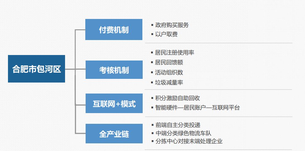 目前北京的16個(gè)區(qū)中我們已經(jīng)在8個(gè)區(qū)中開展了工作,除此之外,2017年1月,中標(biāo)合肥市包河區(qū)生活垃圾分類項(xiàng)目,該項(xiàng)目主要服務(wù)包河區(qū)10萬戶的居民垃圾分類服務(wù)工作。付費(fèi)機(jī)制是政府購買服務(wù),按戶進(jìn)行收費(fèi),每戶280塊錢。還有一套考核機(jī)制,根據(jù)居民注冊使用率、居民回饋額、活動組織數(shù)、垃圾減量率進(jìn)行考核與反饋。