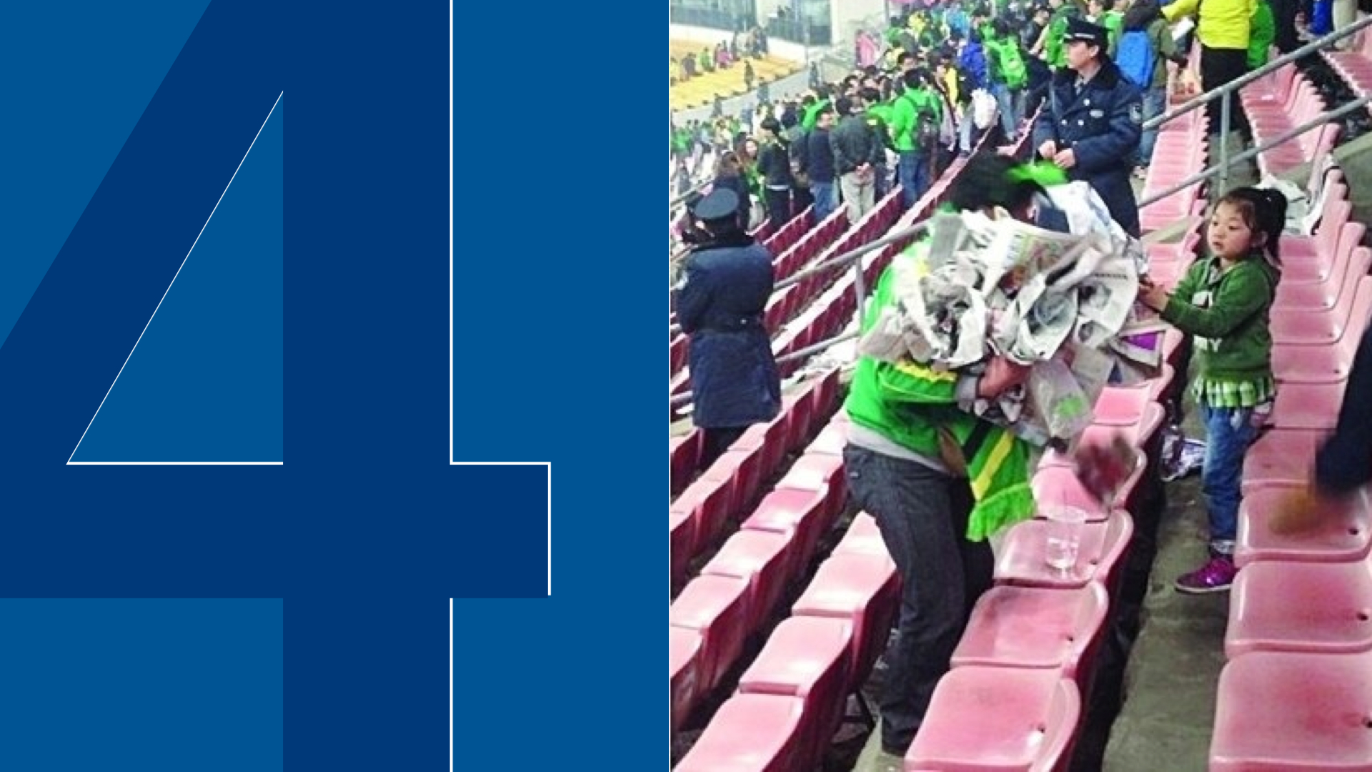 我其實(shí)在我們北京,也看到了一些亮點(diǎn),我是一個(gè)國(guó)安的球迷,國(guó)安每次主場(chǎng)比賽,無(wú)論對(duì)魯能 對(duì)申花,還是對(duì)恒大,不管多貴的票,我也會(huì)一幫朋友去現(xiàn)場(chǎng)看球。過(guò)去我覺(jué)得,我們每次看球,五萬(wàn)觀眾,六萬(wàn)觀眾,當(dāng)一場(chǎng)精彩的球賽完畢的時(shí)候,那么我們整個(gè)工人體育場(chǎng),整個(gè)被垃圾所覆蓋。但是有一天,我突然發(fā)現(xiàn)了這么一個(gè)場(chǎng)景,那么一個(gè)父親和他的一個(gè)小女兒,在比賽結(jié)束的時(shí)候,他們倆把別人,扔到地上的這些垃圾,包括墊在屁股底下這些報(bào)紙,弄到滿頭大汗,他們?cè)谑占@些垃圾。我覺(jué)得這些,它都是一種人性的這種亮點(diǎn)。