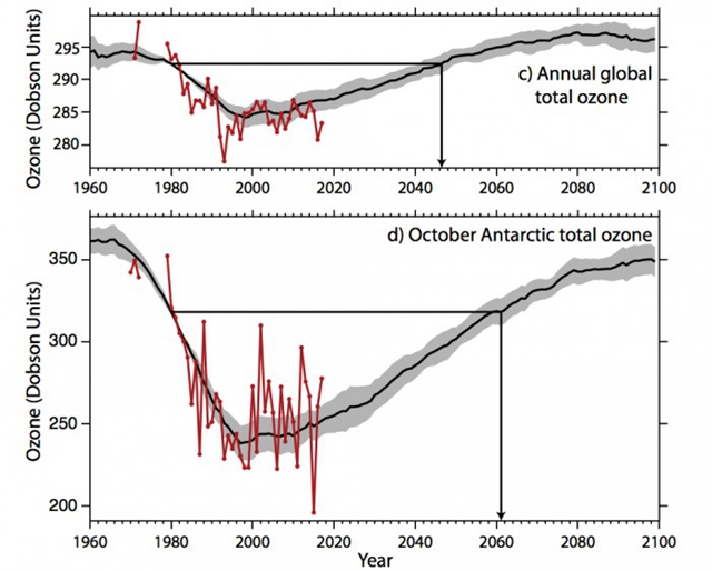 在《2018年臭氧層耗損科學(xué)評(píng)估(Scientific Assessment of Ozone Depletion: 2018)》中,研究人員收集了有關(guān)地球平流層臭氧層恢復(fù)的監(jiān)測(cè)數(shù)據(jù)。如果沒有臭氧,地球上的生命將會(huì)受到來自太陽(yáng)大量有害紫外線的影響,這類紫外線將會(huì)對(duì)人類的未來造成毀滅性影響。
