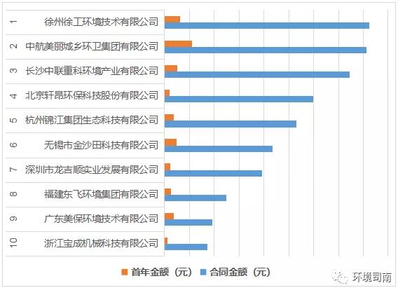 其中:“徐州徐工環(huán)境技術有限公司、中航美麗城鄉(xiāng)環(huán)衛(wèi)集團有限公司、長沙中聯(lián)重科環(huán)境產(chǎn)業(yè)有限公司、杭州錦江集團生態(tài)科技有限公司、深圳市龍吉順實業(yè)發(fā)展有限公司”等10家公司共中標17個項目,合同總金額49.53億元,中標項目首年服務費總金額4.34億元。