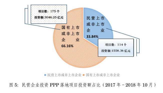 2018年10月,民營(yíng)企業(yè)以聯(lián)合體牽頭方或者單獨(dú)作為社會(huì)資本方落地項(xiàng)目投資額24.41億元。2017年至2018年10月累計(jì)投資額1558.36億元,占33.84%。