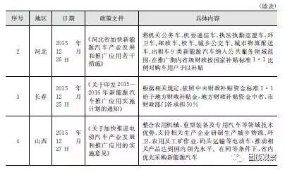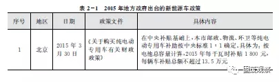 2015年,北京、河北、長春、山西等地陸續(xù)出臺(tái)了相關(guān)新能源車政策,紛紛響應(yīng)中央標(biāo)準(zhǔn)1:1配套補(bǔ)助新能源環(huán)衛(wèi)車,如表2-1所示。