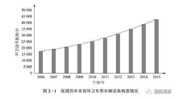 據(jù)國家統(tǒng)計(jì)局統(tǒng)計(jì),截至2015年年底,我國城鎮(zhèn)化率已經(jīng)達(dá)到56.1%。且目前正以年均1個(gè)百分點(diǎn)的速度增長。2015年,全國市容環(huán)衛(wèi)專用車輛設(shè)備共42702臺(tái),同比增加3789臺(tái),如圖2-1所示。