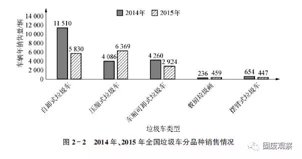 2015年我國垃圾車共完成銷售16386輛,同比下降24.03%。細(xì)分品種, 2015年壓縮式垃圾車?yán)塾?jì)銷量超過6300輛,同比增長55%以上,占2015年全國垃圾車總銷量超過38%,同比提升19%;自卸式垃圾車大幅下降,幅度超過49%,市場(chǎng)份額的下降超過17%;餐廚垃圾車實(shí)現(xiàn)快速增長,銷售459輛,同比增長194.23%,市場(chǎng)份額2.80%,同比提升2.08%;擺臂式垃圾車447輛,同比降低31.65%,市場(chǎng)份額2.73%。