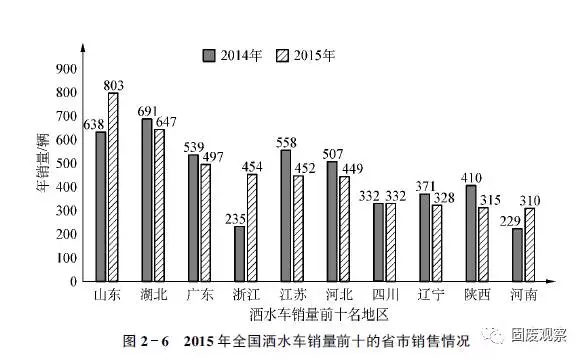 2015年,我國灑水車銷量前十名的地區(qū)有山東、湖北、廣東、浙江、江蘇、河北、四川、遼寧、陜西、河南。其中,山東省銷售超過800輛,同比增長超過25%,在2015年全國灑水車總銷量(下同)中的占有份額超過10%,同比提升2.73%;湖北、廣東、浙江、江蘇、河北分列全國灑水車分省銷量第2~6位,累計(jì)銷量均在400輛以上,占有份額分別達(dá)到8.41%、6.46%、5.90%、5.88%的5.84%。累計(jì)銷量同比,湖北和廣東分別遭遇到6%和7%以上的下降,江蘇和河北分別下降19%和11%以上。