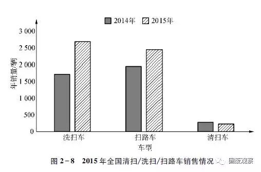 2015年,我國合計(jì)完成清掃車、洗掃車、掃路車銷售5386輛,同比增長36.01%。細(xì)分市場(chǎng),洗掃車和掃路車?yán)塾?jì)銷量同比均實(shí)現(xiàn)增長,分別達(dá)到2700輛和2459輛,同比增幅分別在56%和25%以上,在2015年全國清掃/洗掃/掃路車總銷量中的占有率分別在50%和45%以上,同比分別增長6%和下降3%以上。