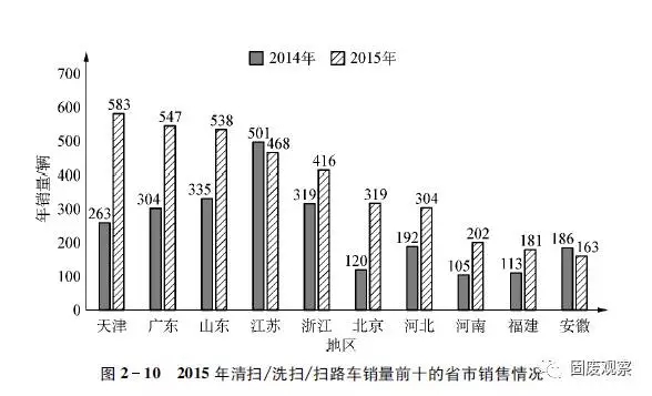 2015年,我國清掃車、洗掃車、掃路車銷售排名前十的區(qū)域有天津、廣東、山東、江蘇、浙江、北京、河北、河南、福建、安徽等,除江蘇和安徽2省之外,同比均實(shí)現(xiàn)增長,且幅度均在30%以上。