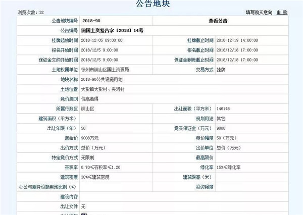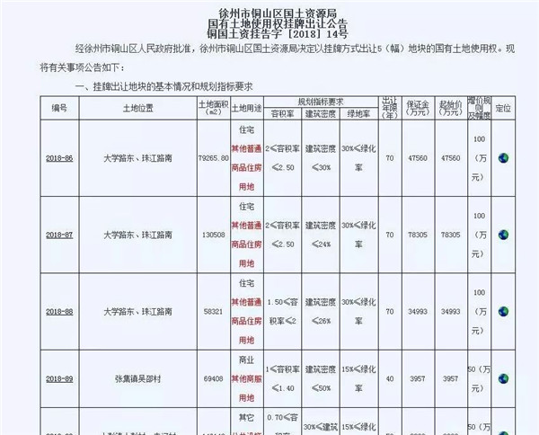 巧合的是,該幅地塊同徐州市銅山區(qū)國土資源局于10月18日發(fā)布的國有土地使用權(quán)掛牌出讓公告銅國土資掛告字[2018]12號中的2018-77地塊為同一地塊。