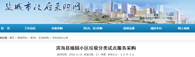 江蘇省鹽城市濱??h臻園小區(qū)垃圾分類試點(diǎn)服務(wù)采購(gòu)項(xiàng)目發(fā)布中標(biāo)公示,中國(guó)天楹股份有限公司成為中標(biāo)的社會(huì)資本方,中標(biāo)金額為315800.00元,服務(wù)期限為365日歷天。