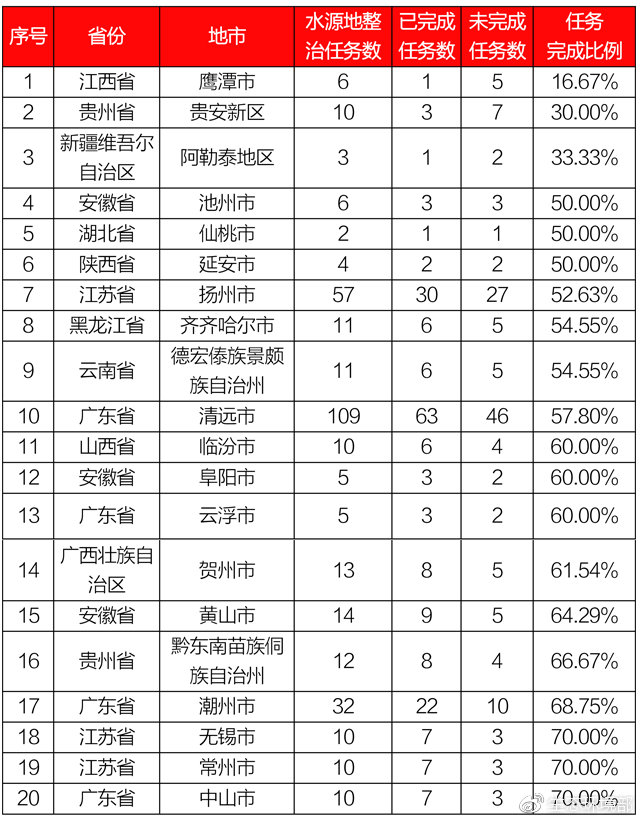 水源地環(huán)境問題整治進(jìn)展后20位地市