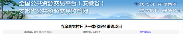 2018年11月23日,安徽省馬鞍山市當(dāng)涂縣農(nóng)村環(huán)衛(wèi)一體化服務(wù)采購項目發(fā)布招標(biāo)公告。