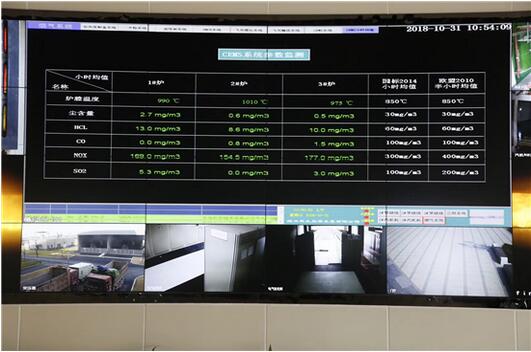 2018年10月31日上午,萬(wàn)里行記者在紹興市垃圾焚燒發(fā)電廠中控室拍下該廠3臺(tái)正在運(yùn)行的焚燒爐煙氣中污染物的實(shí)測(cè)數(shù)據(jù),這些數(shù)據(jù)全部達(dá)到我國(guó)《生活垃圾焚燒污染控制標(biāo)準(zhǔn)》(GB18485-2014)的小時(shí)均值和《歐盟工業(yè)排放指令》(2010/75/EC)的半小時(shí)均值要求。比如:1號(hào)焚燒爐,爐溫為990℃,塵含量為2.7毫克/立方米,HCl為13毫克/立方米,CO為0毫克/立方米,NOX為169毫克/立方米,SO2為5.3毫克/立方米,都大大優(yōu)于2014國(guó)標(biāo)和2010歐盟標(biāo)準(zhǔn)。記者又來(lái)到廠區(qū)大門,看到湛藍(lán)的天空下一塊巨大的LED屏實(shí)時(shí)公布了污染物排放的實(shí)測(cè)數(shù)據(jù)。