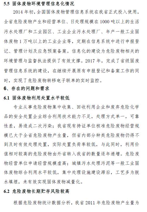固體廢物污染防治是環(huán)境保護工作的重要組成部分,尤其是危險廢物(含醫(yī)療廢物),因其含有有毒有害成分,若利用和處置不當,將對水體、大氣和土壤造成嚴重污染,甚至威脅人民群眾身心健康。妥善利用、處置固體廢物是防范環(huán)境風險的重要措施之一,是整體改善水、大氣和土壤環(huán)境質量的重要保障?!笆濉逼陂g,按照《危險廢物“十二五”污染防治規(guī)劃》要求,查清了全省固體廢物的現狀,對全省危險廢物產生單位實施分級、標準化管理,危險廢物規(guī)范化管理和經營水平不斷提高。