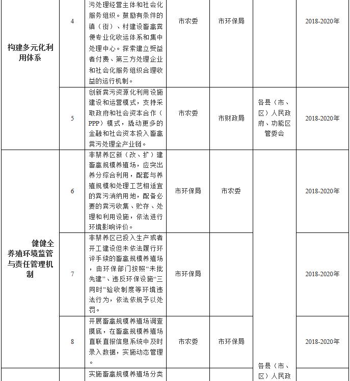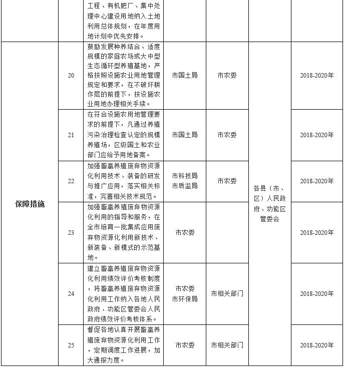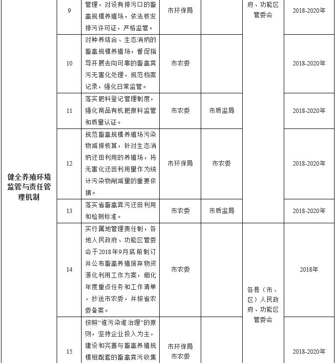 (九)堅持屬地責任管理。畜禽養(yǎng)殖廢棄物資源化利用實行屬地管理責任制,各地人民政府、功能區(qū)管委會對本行政區(qū)域內(nèi)的畜禽養(yǎng)殖廢棄物資源化利用工作負總責,強化組織領(lǐng)導,明確部門職責,建立協(xié)調(diào)機制,加強政策扶持,強化日常監(jiān)管,健全督查制度和巡查機制,確保各項任務落實到位。堅持保供給與保生態(tài)并重,落實“菜籃子”市長負責制,統(tǒng)籌環(huán)境保護與畜牧業(yè)協(xié)調(diào)發(fā)展。各縣(市、區(qū))人民政府、功能區(qū)管委會應于2018年10月底前制訂并公布畜禽養(yǎng)殖廢棄物資源化利用工作方案,細化年度重點任務和工作清單,抄送市農(nóng)委,并報省農(nóng)委備案。