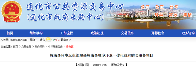 2018年11月22日,吉林省通化市輝南縣城鄉(xiāng)環(huán)衛(wèi)一體化政府購買服務(wù)項(xiàng)目發(fā)布中標(biāo)公示,中國天楹股份有限公司成為中標(biāo)的社會(huì)資本方,中標(biāo)金額為3793.29萬/年,服務(wù)期限3年,中標(biāo)總金額達(dá)1.14億。
