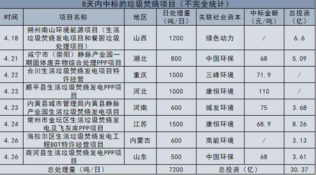 中國固廢網(wǎng)從E20環(huán)境平臺標(biāo)訊采集系統(tǒng)(信息來源:全國各級政府采購網(wǎng)/公共資源交易平臺)獲悉,4月18日至4月26日的8天內(nèi),已有8個垃圾焚燒項目敲定了(預(yù))中標(biāo)的社會資本方,包括綠色動力、三峰環(huán)境、城發(fā)環(huán)境、康恒環(huán)境、中國環(huán)保、高能環(huán)境在內(nèi)的企業(yè)都分得了焚燒市場的“一杯羹”...