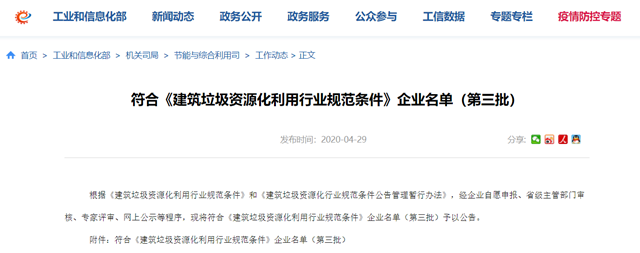 日前,工信部發(fā)布符合《建筑垃圾資源化利用行業(yè)規(guī)范條件》企業(yè)名單(第三批)。共涉及五家企業(yè)。 中華人民共和國工業(yè)和信息化部 中華人民共和國住房和城鄉(xiāng)建設(shè)部公告 2020年 第14號 根據(jù)《建筑垃圾資源化利用行業(yè)規(guī)范條件》和《建筑垃圾資源化行業(yè)規(guī)范條件公告管理暫行辦法》,經(jīng)企業(yè)自愿申報、省級主管部門審核...