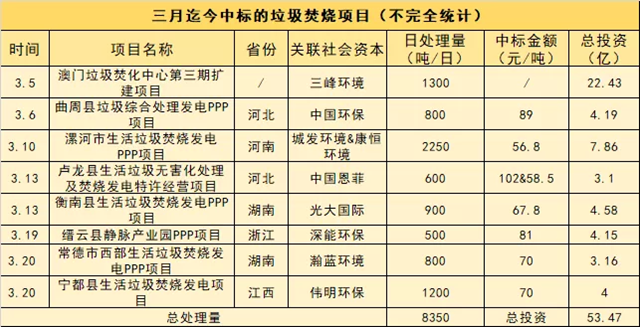 3月初至今,中國固廢網(wǎng)不完全統(tǒng)計發(fā)現(xiàn),半個月的時間內(nèi),已有8個垃圾焚燒項目敲定了中標(biāo)的社會資本方,包括三峰環(huán)境、中國環(huán)保、康恒環(huán)境、中國恩菲、光大國際、深能環(huán)保、瀚藍(lán)環(huán)境、偉明環(huán)保在內(nèi)的知名企業(yè)都分得了焚燒市場的“一杯羹”。八大項目涉及總投資達(dá)53.47億,垃圾焚燒市場由此增...